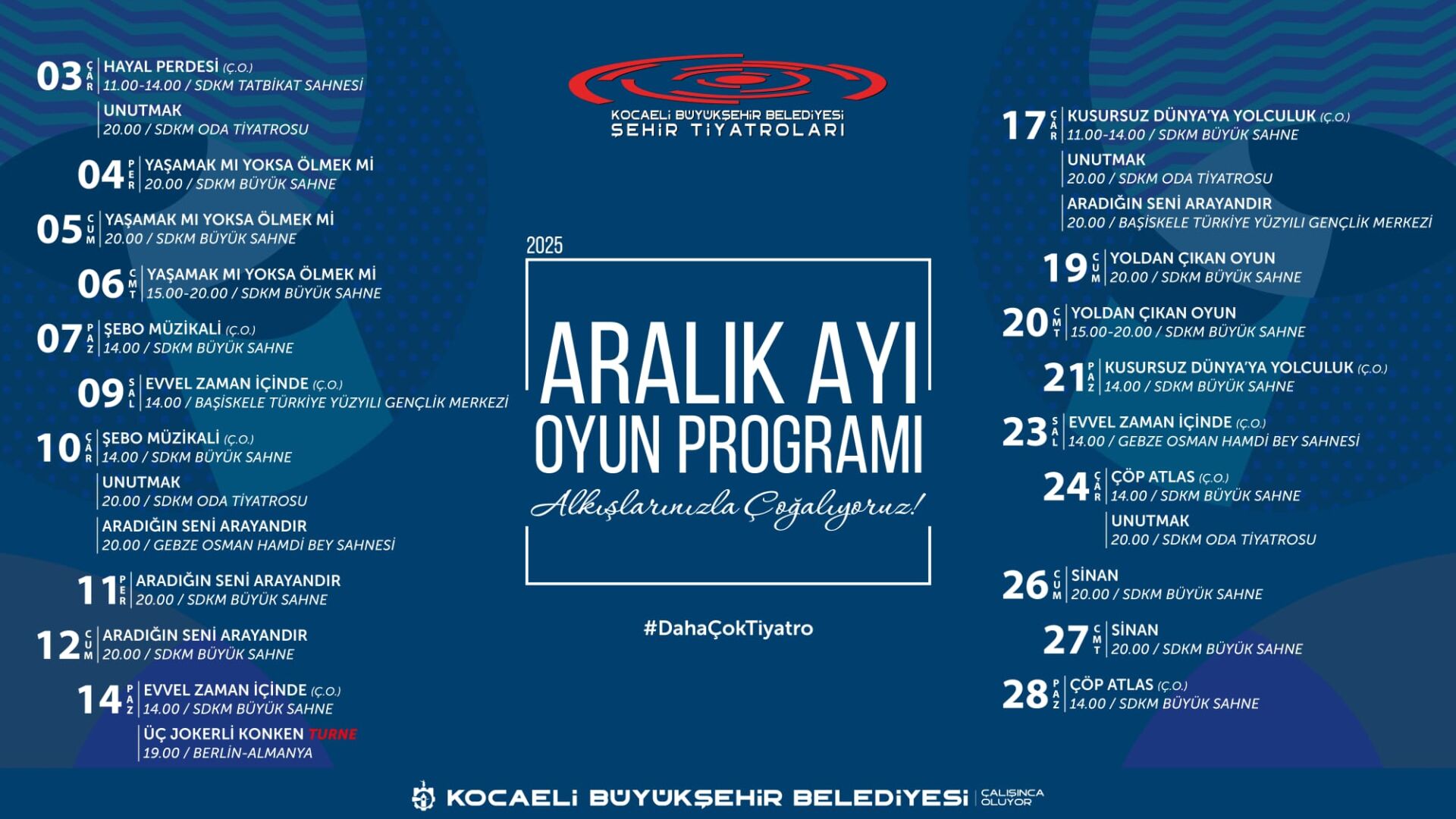 Kocaeli Büyükşehir Belediyesi’ne bağlı Şehir Tiyatroları, yeni sezona dopdolu bir repertuvarla giriyor. Çocuklardan yetişkinlere kadar her yaştan seyirciyi sahnelerinde ağırlamaya hazırlanan Şehir Tiyatroları; özel prömiyerler, turneler ve ödüllü yapımlarla sanatseverlere unutulmaz bir yıl yaşatacak.