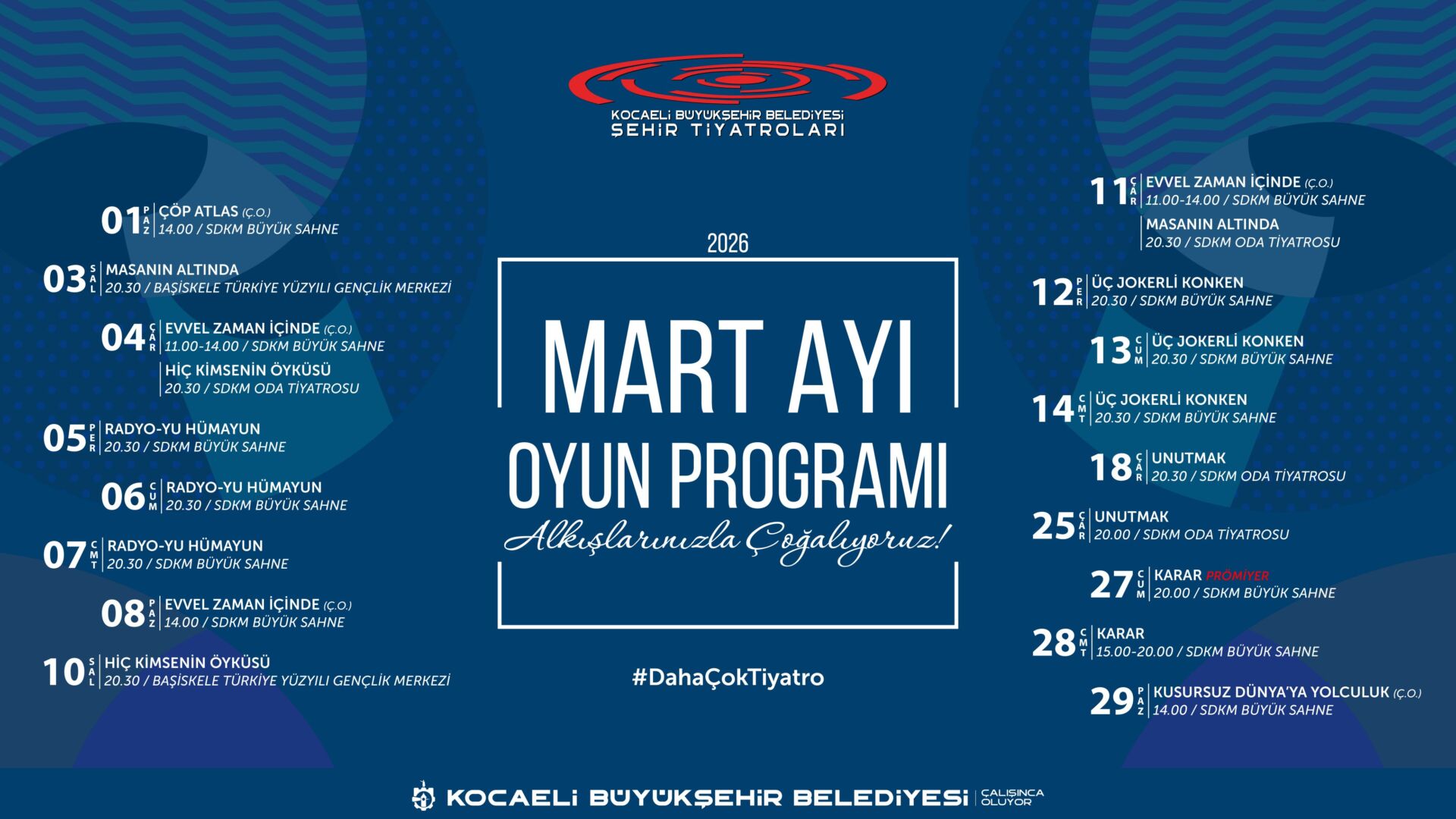 Kocaeli Büyükşehir Belediyesi’ne bağlı Şehir Tiyatroları, yeni sezona dopdolu bir repertuvarla giriyor. Çocuklardan yetişkinlere kadar her yaştan seyirciyi sahnelerinde ağırlamaya hazırlanan Şehir Tiyatroları; özel prömiyerler, turneler ve ödüllü yapımlarla sanatseverlere unutulmaz bir yıl yaşatacak.